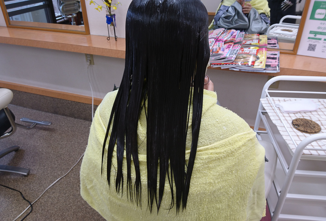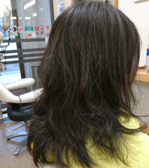 7、全ての工程が終わりました。後はドライヤーでバーっと乾かします。当店は、なるべくしっかりブローをしない状態でお客様に見て頂くようにしています。家に帰って自分で洗ったら全然伸びてなかった。ということが少ないようにです。