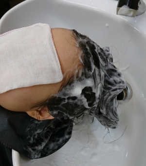 薬が浸透している場合は、1度 シャンプー台にて流していきます。しっかり流して、シャンプー剤はほんの軽くだけつけます。