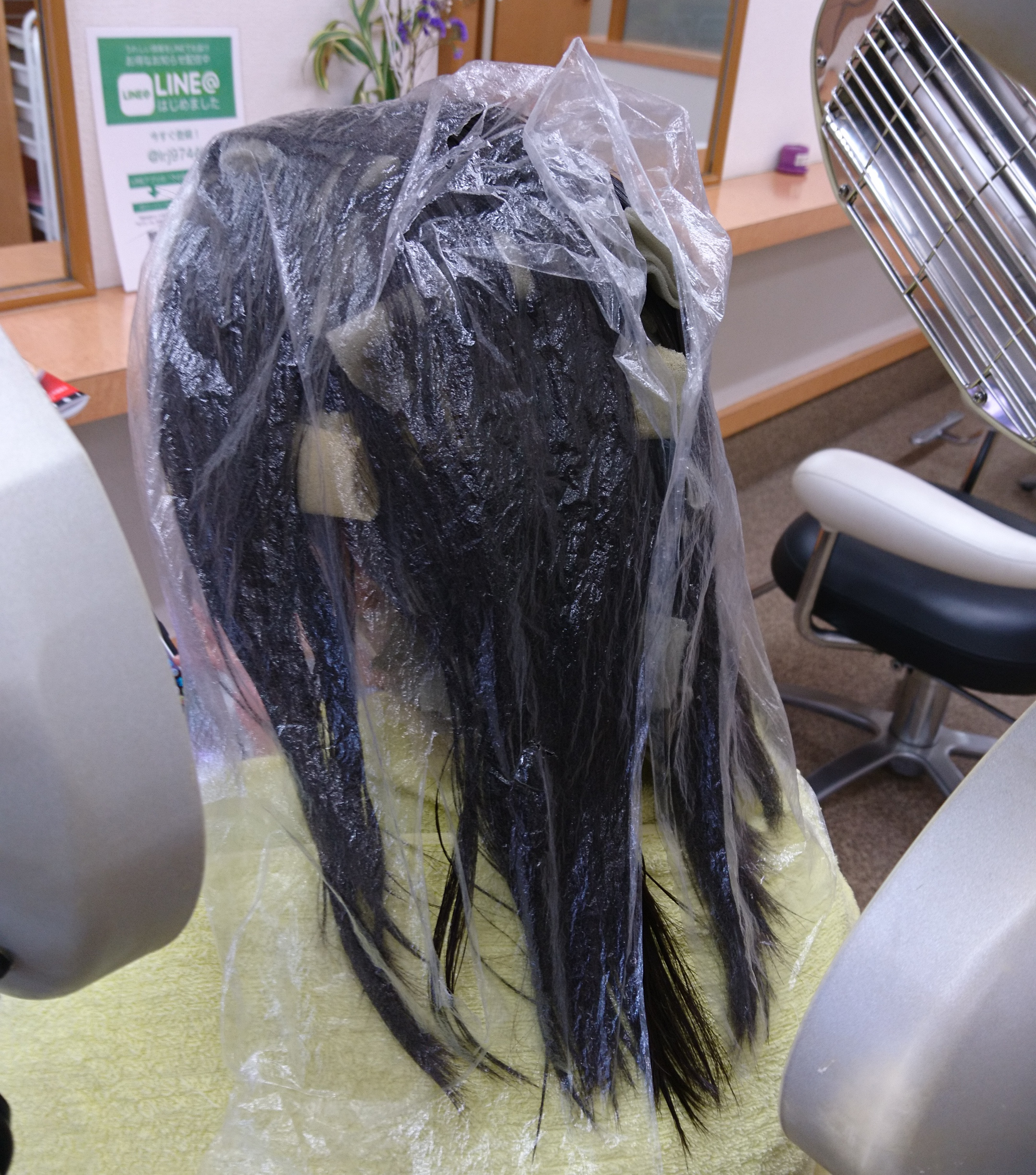 1、髪の毛の状態を見ながら、髪の毛に合った薬を調合しながら、髪の毛に合った強さの薬を付けて行きます。全体に薬を付け終わりましたら、熱をあてていきます。